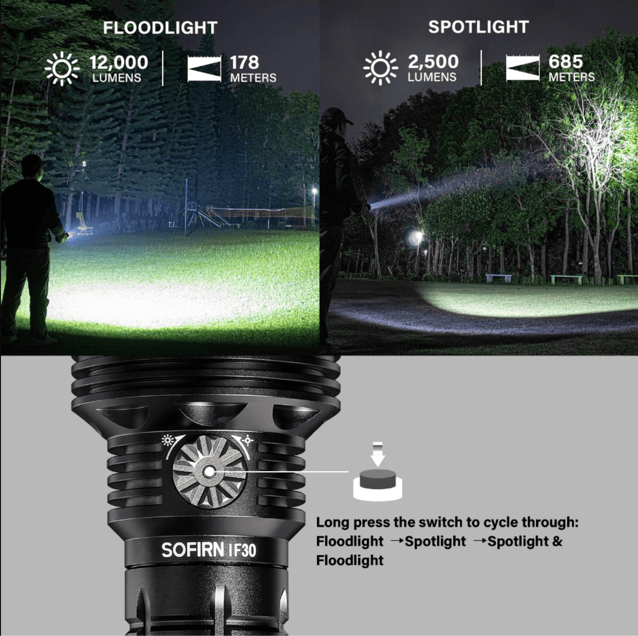 1. Đầu ra ấn tượng: Với đèn LED 12 * TN-3535 bao quanh đèn chính, IF30 cung cấp công suất 12000 lumen ấn tượng cho chùm tia lũ và 2500 lumen cho đèn LED trung tâm. Tỏa sáng rực rỡ trên đường đi 685 mét, cho phép bạn quan sát tuyệt vời trong bóng tối. Phải có để đi bộ đường dài, tìm kiếm, cứu hộ, trường hợp khẩn cấp và hơn thế nữa.