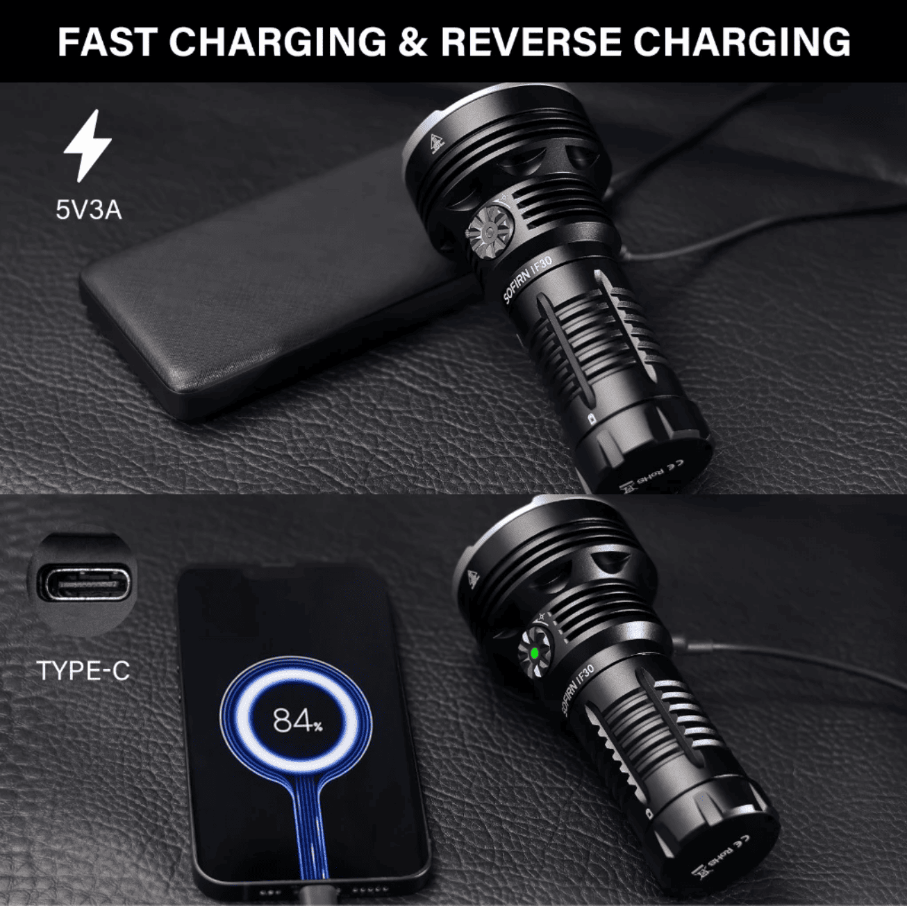 3. Có thể sạc lại và xả: Đèn pin cầm tay ẩn một cổng sạc USB C trên đầu, giúp việc sạc hàng ngày trở nên thuận tiện. Có khả năng sạc 120W và sạc ngược. Có thể sạc miếng đệm của bạn hoặc bất kỳ thiết bị nào sử dụng nguồn điện USB-C hoặc cấp nguồn cho điện thoại của bạn trong trường hợp khẩn cấp.